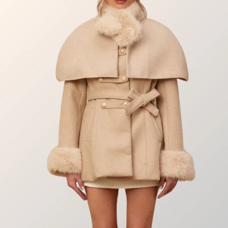 Steeped in French tradition, this piece weaves together structure and softness—a detachable cape for flair, faux fur for a whisper of decadence, and a silhouette that carries the quiet luxury of the Champs-Élysées.
